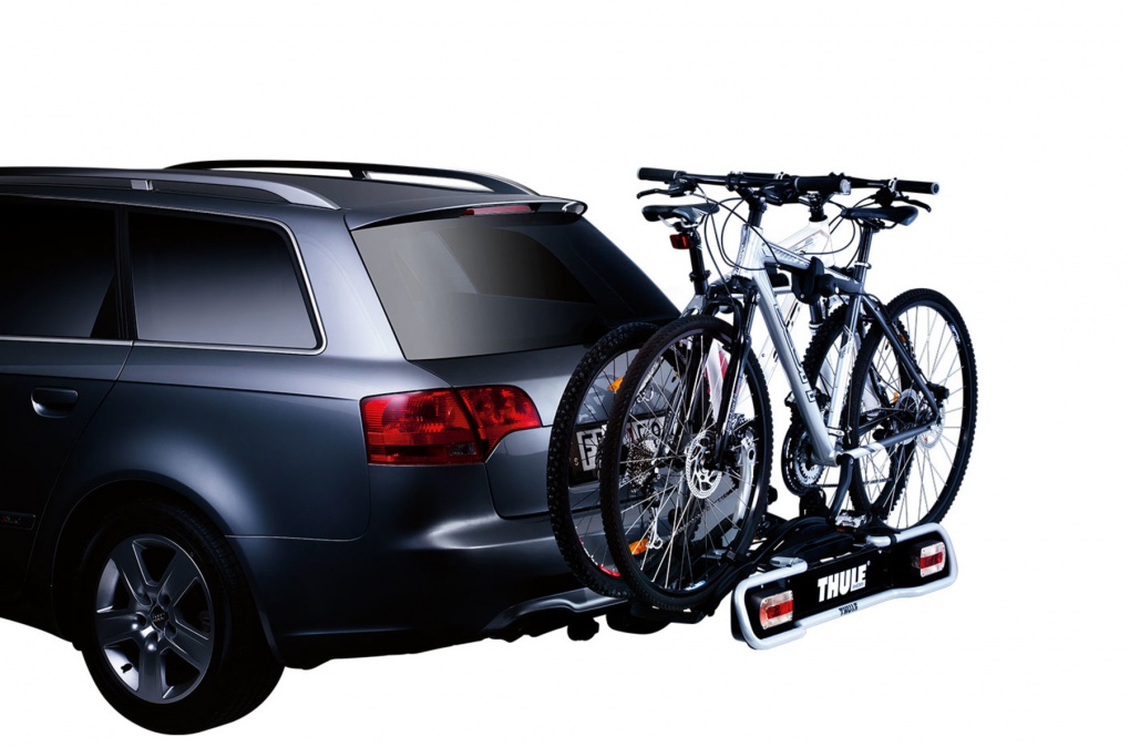 Функциональное крепление для велосипедов, удовлетворяющее всем основным требованиям (для 2 велосипедов).Наклон, выполняемый вручную, позволяет получить доступ к багажнику, даже если велосипеды установлены.